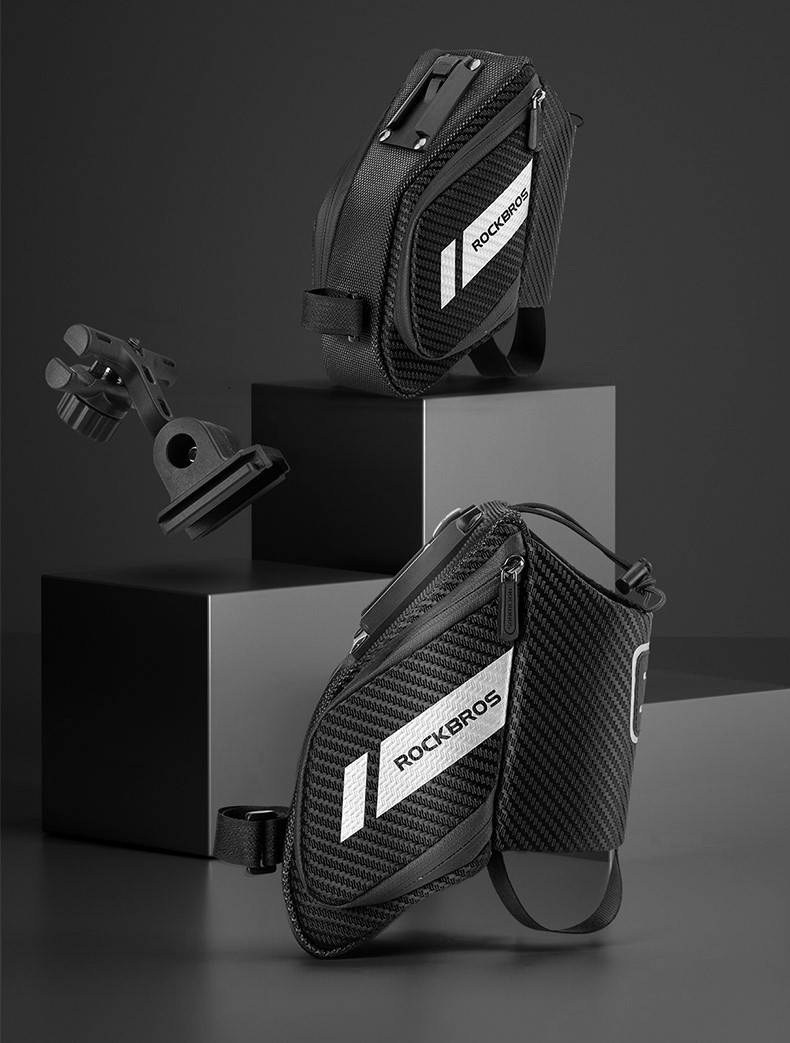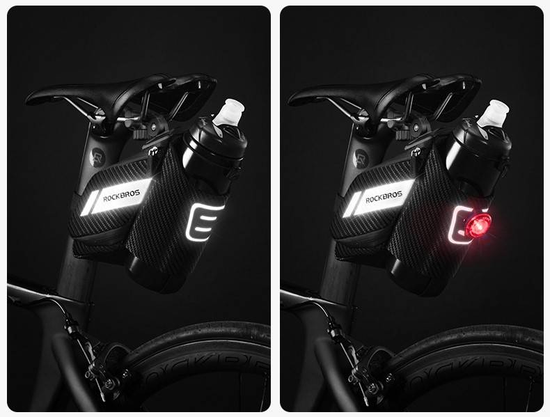 Reflexivo e com encaixe para luz de segurança: A Bolsa de Selim Impermeável com Compartimento para Garrafas Rockbros é construída com material reflexivo e possui encaixe traseiro para luz de segurança, sendo perfeita para práticas noturnas: