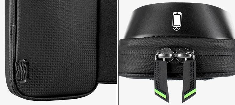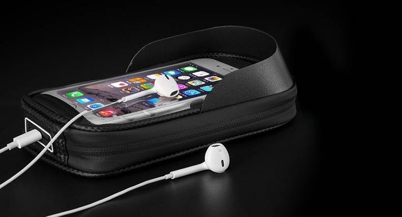 Fones de ouvido: A Bolsa de Quadro Touch Screen Impermeável Rockbros possui abertura para fones de ouvido com fio e suporta o funcionamento de fones sem fio:
