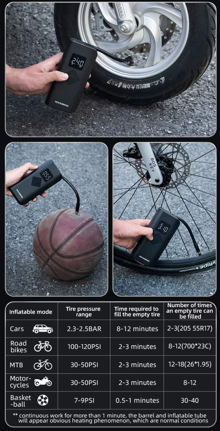 Inflagem Contínua para Múltiplos Pneus: Potência estável para encher vários pneus sem interrupções. Ideal para bicicletas, motos e carros, garantindo mais autonomia e tranquilidade onde você estiver:
