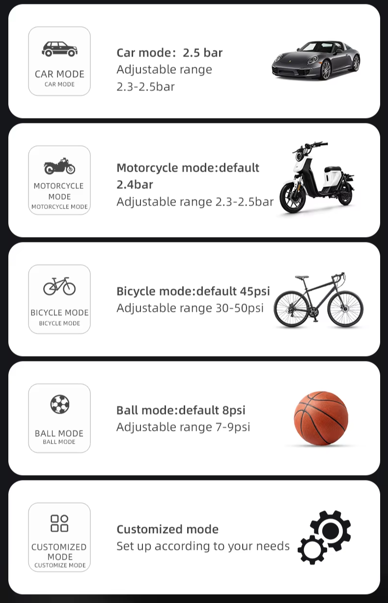 4 Modos Pré-Definidos + 1 Modo Personalizado: Escolha entre modos para carro, moto, bicicleta e bola, com pressão ajustada automaticamente para evitar excesso:
