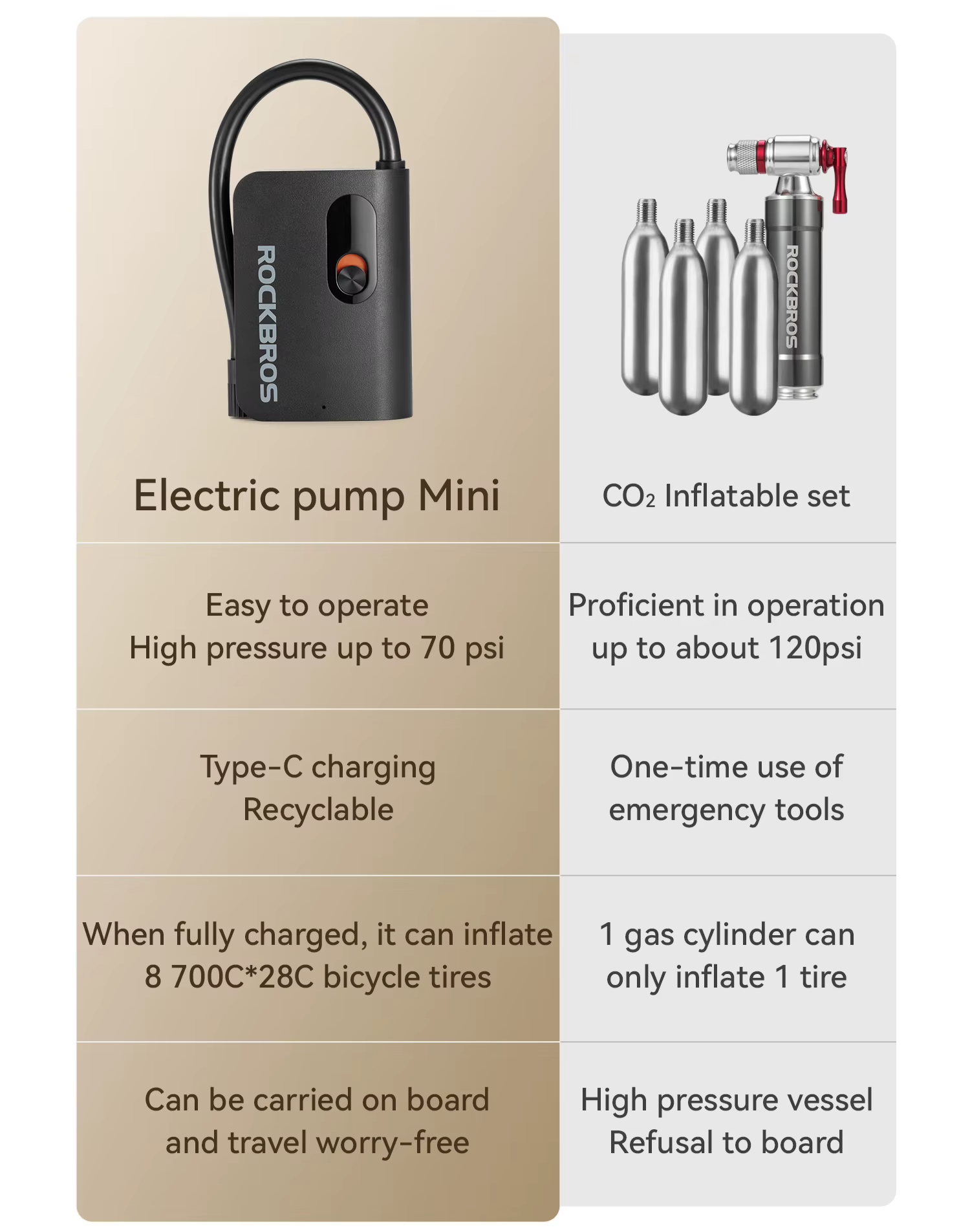 Comparativo de Desempenho – Mais Praticidade e Economia: A bomba elétrica Mini oferece pressão de até 70PSI, recarga USB-C e múltiplas inflagens com uma única carga. Diferente do kit CO₂, que é descartável e infla apenas um pneu por cilindro, ela é reutilizável, econômica e ideal para levar em qualquer pedal ou viagem:
