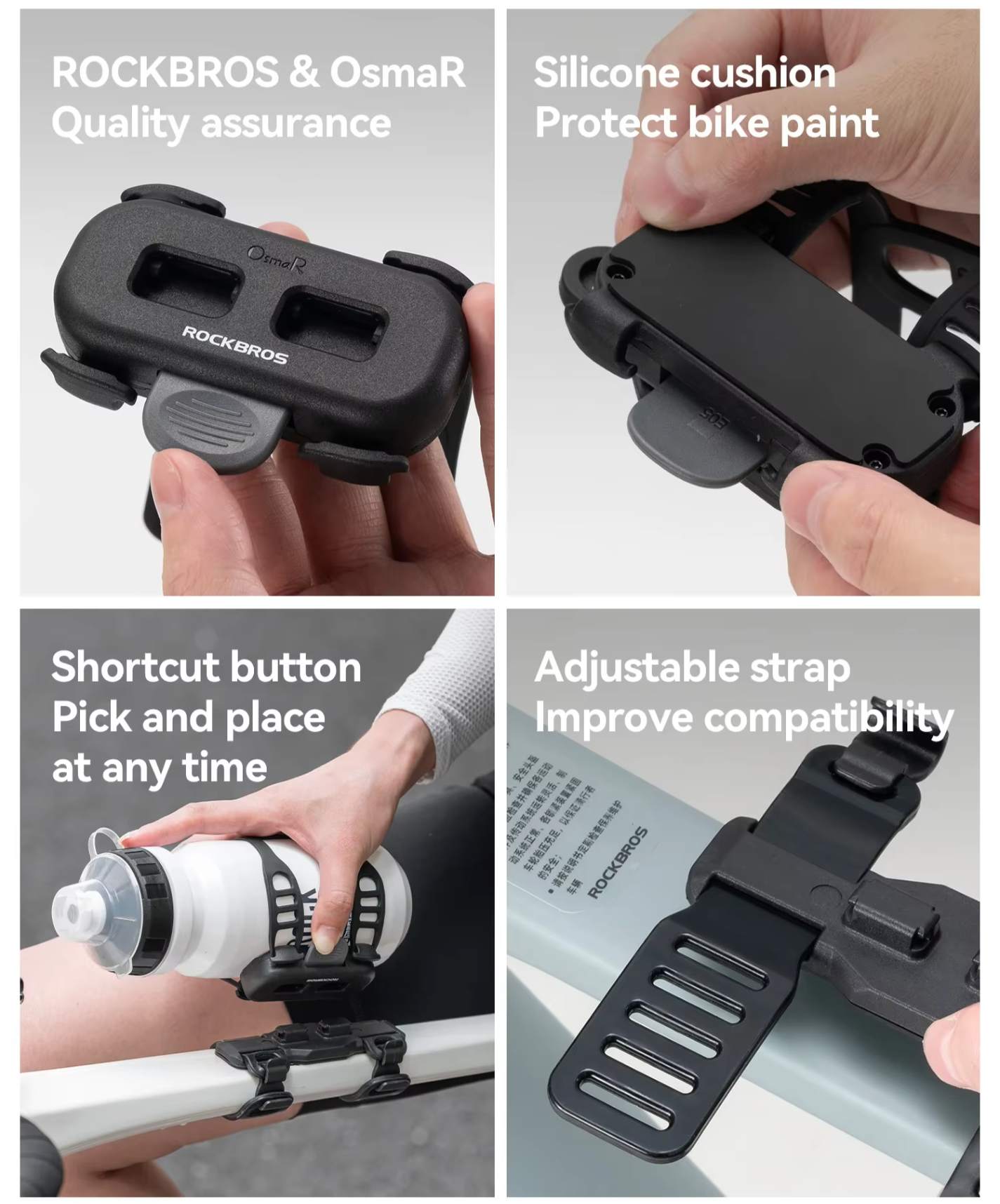 Detalhes que Fazem a Diferença: Base com proteção em silicone para evitar riscos na bike, botão de liberação rápida para retirar a garrafa facilmente e cinta ajustável que garante melhor compatibilidade e fixação segura: