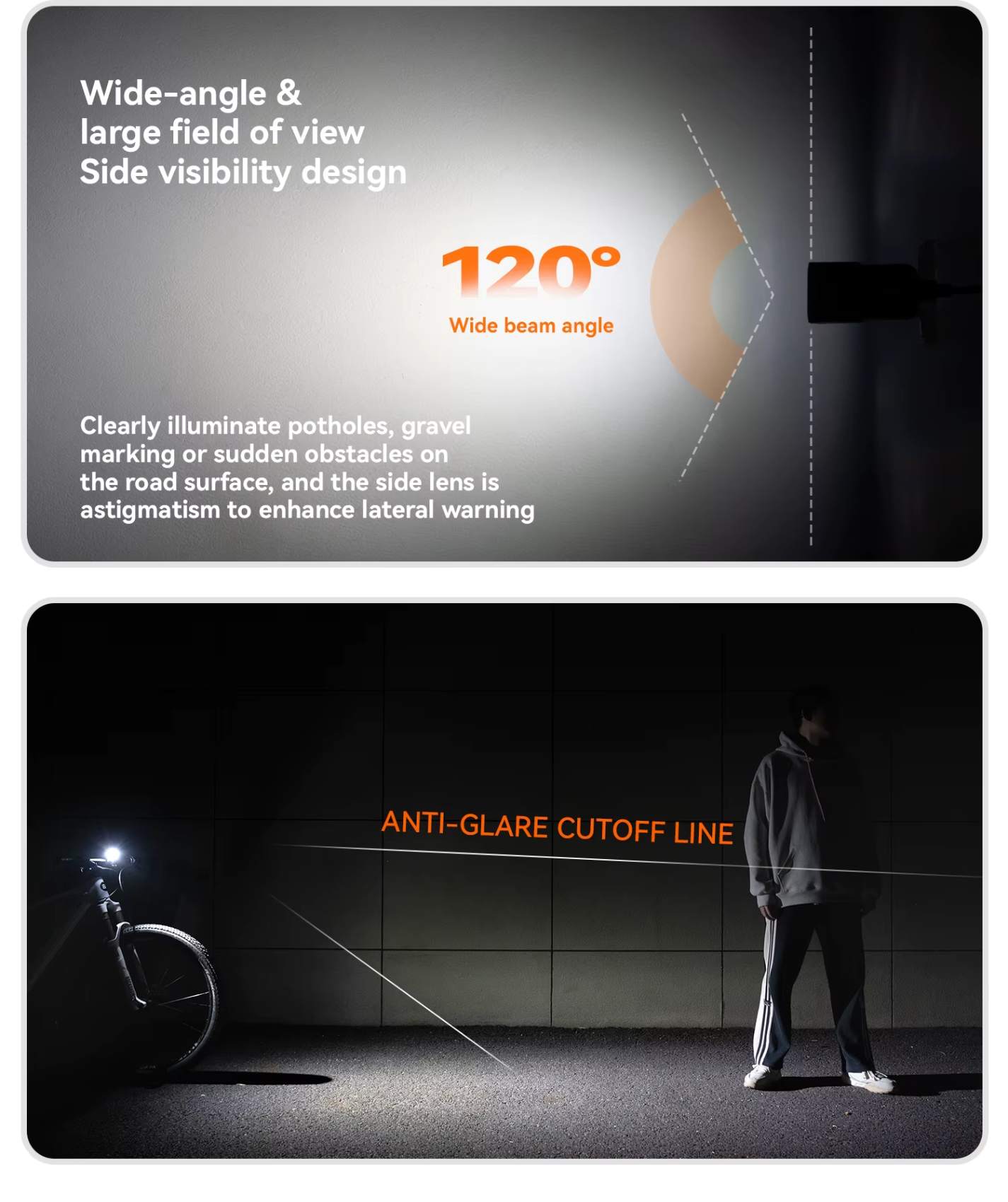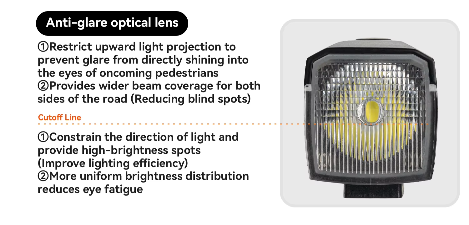 Lente com Corte de Luz Anti-Ofuscamento: Ilumina com clareza sem incomodar outras pessoas, com feixe amplo de 120° para melhor visão lateral e mais segurança:
