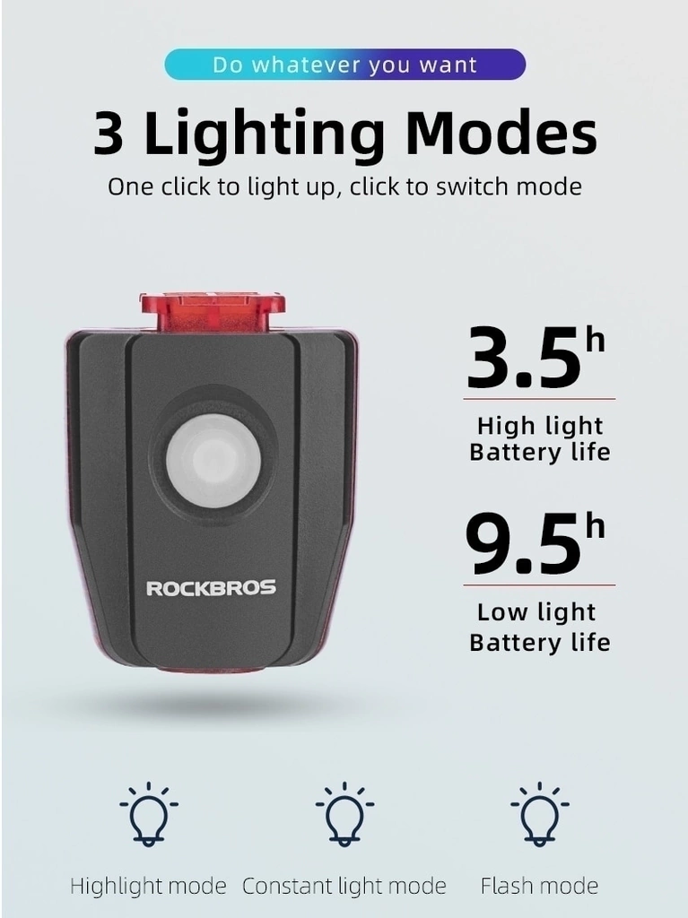 Battery:Buit-in 200mAh battery Dimensions:About 4.5x3.5x2cn Viewing angle:180 degree Charging time:About 2 hours Lighting mode: Highight/stedy/flashing Product name:Side view warning tail light Material quality:PC shell Light source:2835 patch Weight:About 20g (without base) Brightness: About 20 lumens-100 lumens Power supply mode:USB charging Waterproof level:Life waterproof