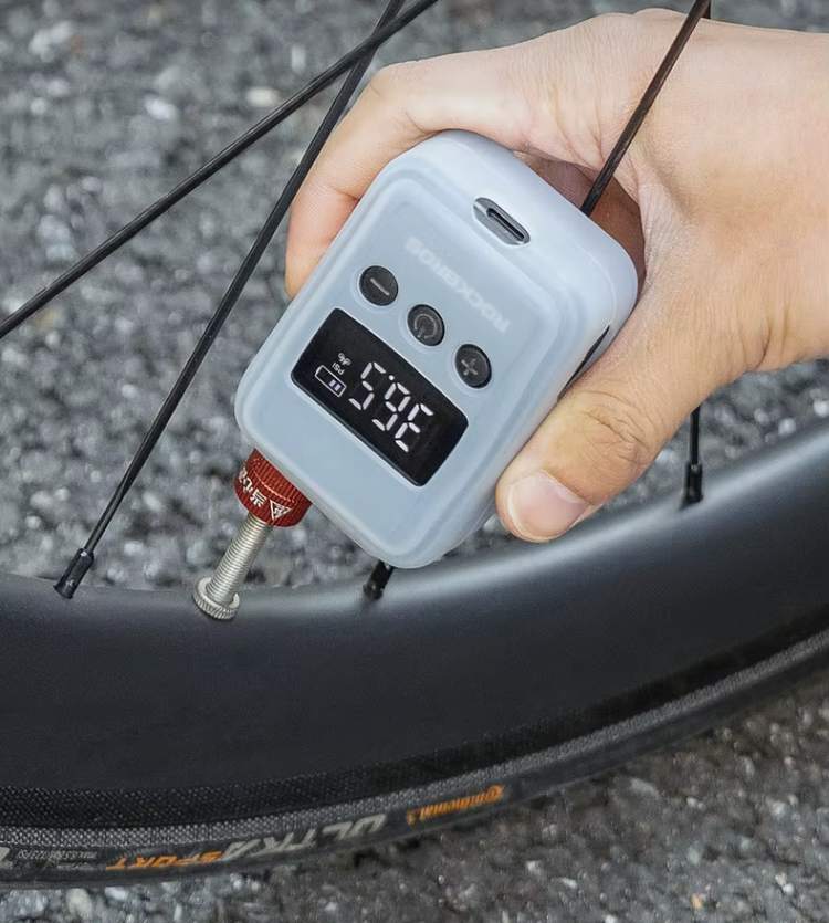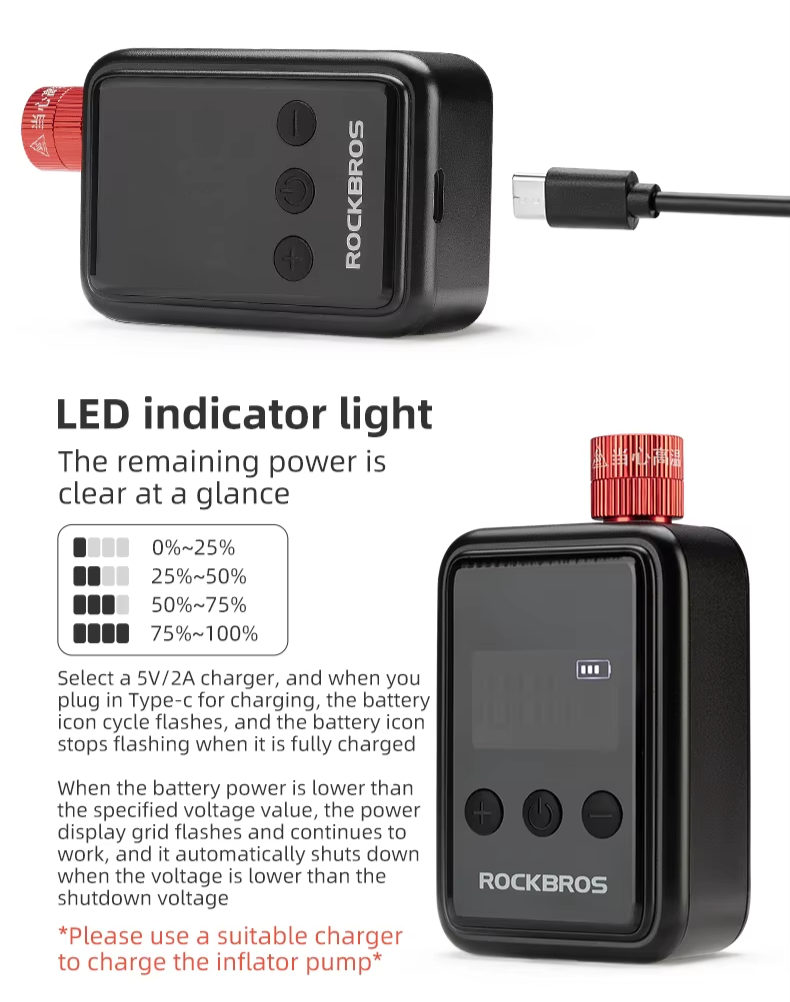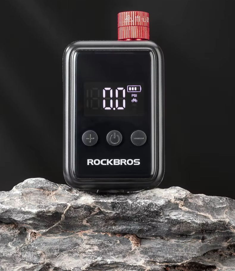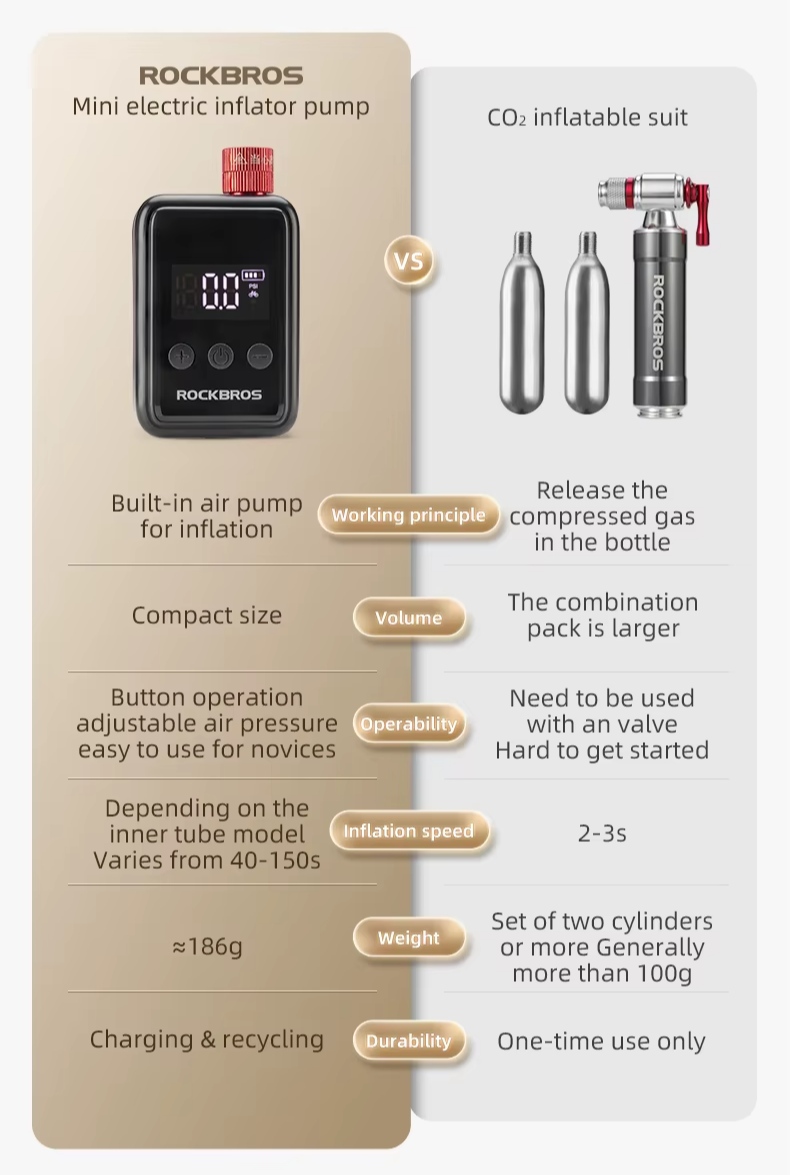 💨 Infle com mais praticidade e durabilidade: A mini bomba elétrica Rockbros é leve, reutilizável, fácil de usar e ideal para longas distâncias — ao contrário dos kits de CO₂, que são descartáveis e menos intuitivos: