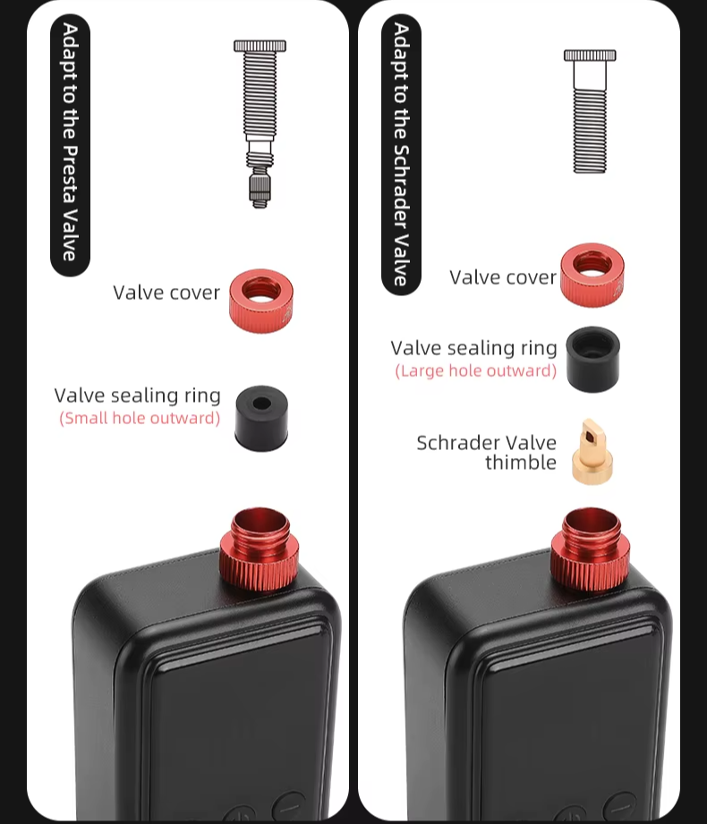 Compatível com válvulas Schrader e Presta: Adapte facilmente a válvula do inflador elétrico conforme necessário. A configuração padrão é para válvulas Schrader, mas pode ser ajustada para Presta com simples troca da vedação interna. Prático e versátil para qualquer bicicleta: