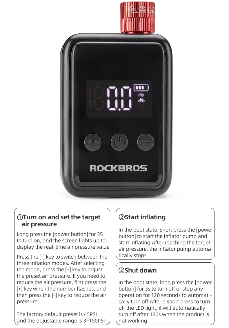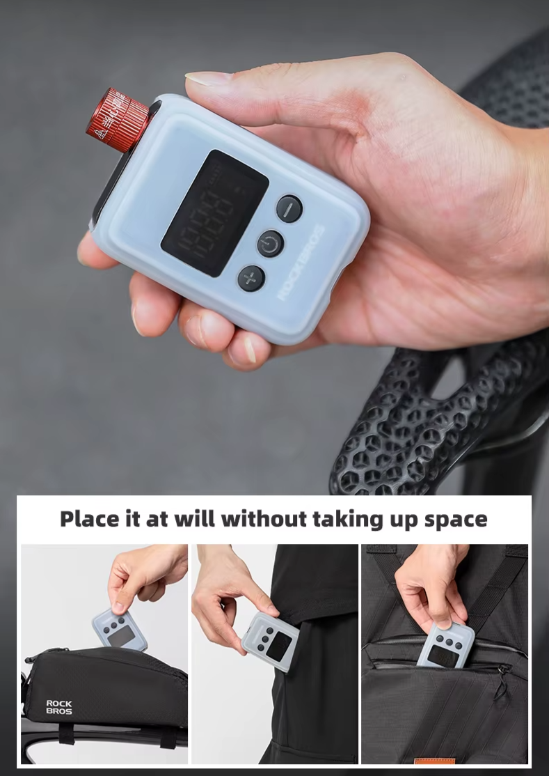 Leve, compacto e sempre à mão: O mini compressor portátil RockBros cabe na palma da sua mão e pode ser facilmente guardado em qualquer bolsa, mochila ou bolso. Ideal para levar em pedaladas, trilhas ou viagens, sem ocupar espaço e sempre pronto para uso: