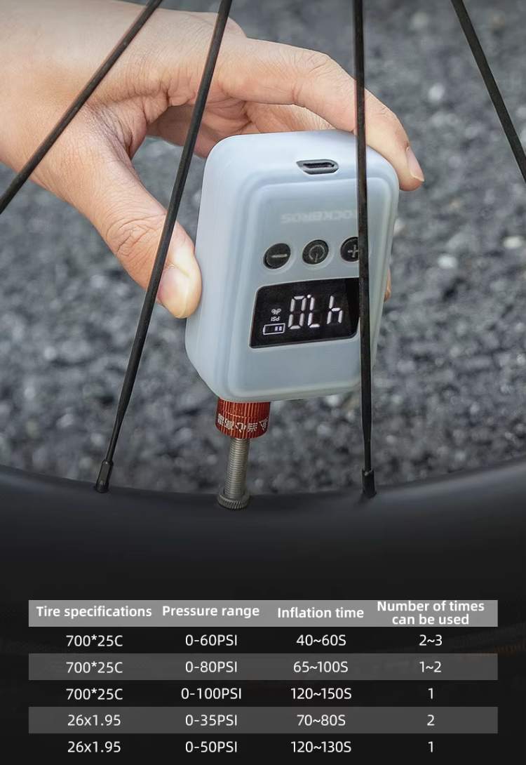 Alta Potência em um Tamanho Compacto: Motor potente com alto desempenho para encher pneus rapidamente. Ideal para ciclismo, com tabela de tempo de inflação e pressão para diferentes tipos de pneus: