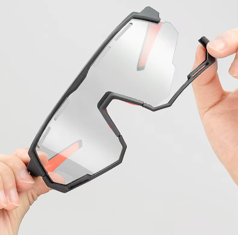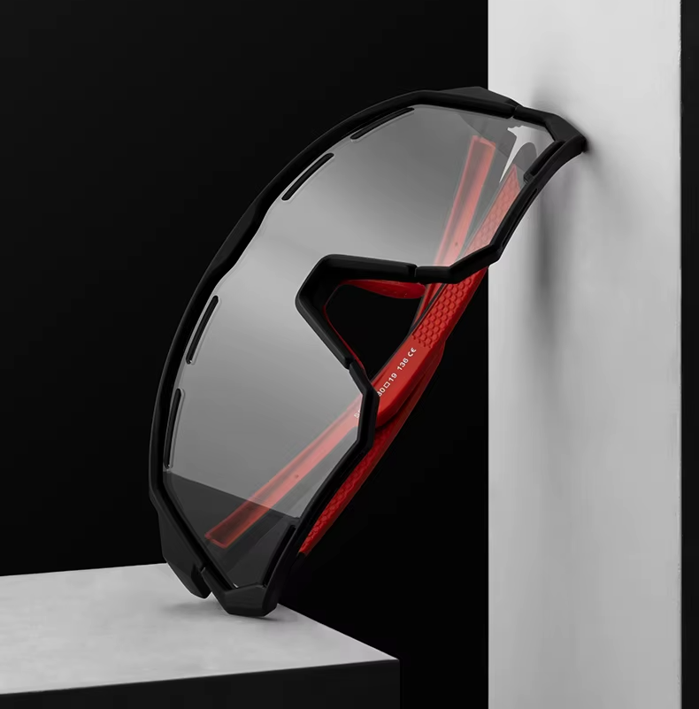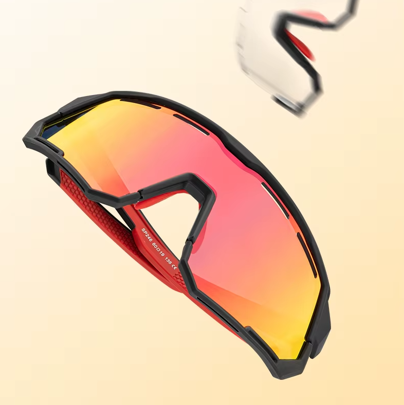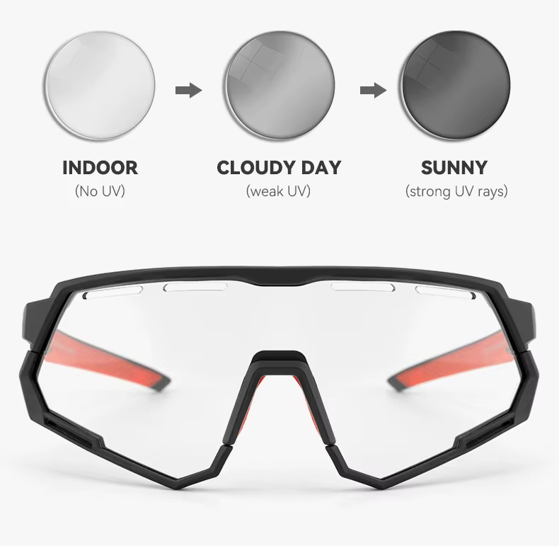 Lentes Intercambiáveis: Lente polarizada ou Lente fotocromática: Equipado com um par de lentes polarizadas preto e vermelho e um par de lentes fotocromáticas para você escolher a lente apropriada de acordo com o ambiente: