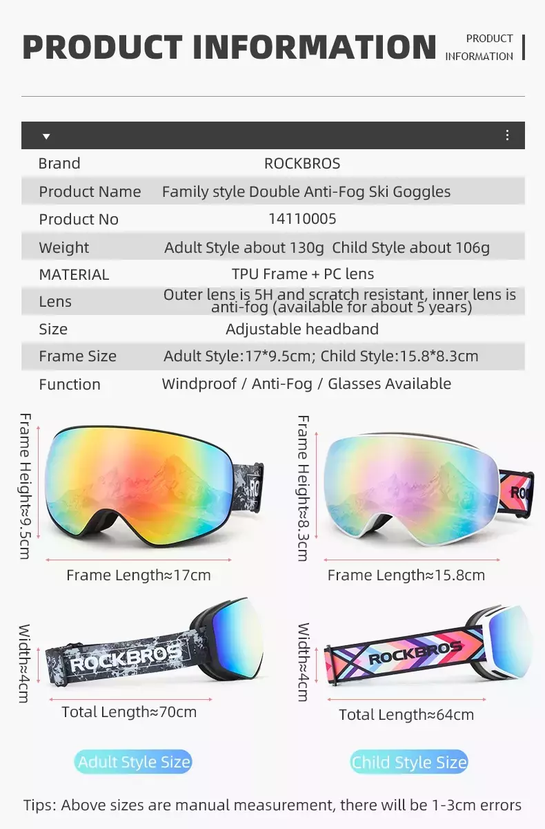 Óculos de Esqui Antiembaçante ROCKBROS: Lente dupla com visão ampla em HD e proteção antiembaçante. Compatível com óculos de grau e capacete. Ideal para adultos e crianças: