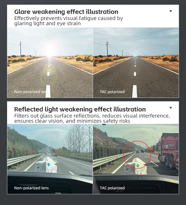 Lente Polarizada TAC – Visão Clara e Confortável: Bloqueia raios UV e reduz reflexos e brilho intenso, filtrando a luz dispersa para uma visão mais nítida, confortável e sem fadiga ocular: