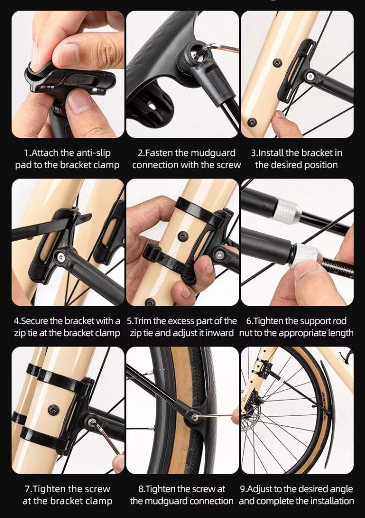Instalação Rápida em 9 Passos: Processo simples e intuitivo: aplique o pad antiderrapante, fixe o suporte, prenda com abraçadeiras, ajuste o comprimento da haste e finalize o ângulo do paralama. Montagem firme, segura e sem complicações, pronta para pedalar: