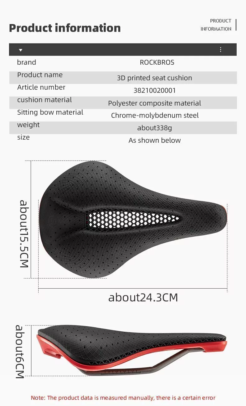 Rockbros é alimentado por hyperganic, uma empresa de plataforma de software de impressão 3d. O coxim do assento é projetado ergonomicamente. O grau de amortecimento é projetado de acordo com os grupos musculares que estão em contato durante o passeio. O grau de amortecimento é projetado para proporcionar conforto em áreas específicas. O amortecimento absorve o impacto e melhora a estabilidade para o conforto. Experiência de condução segura