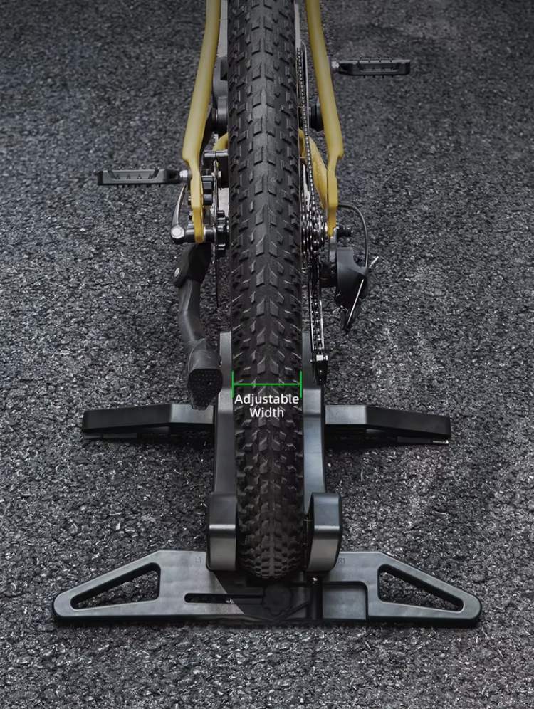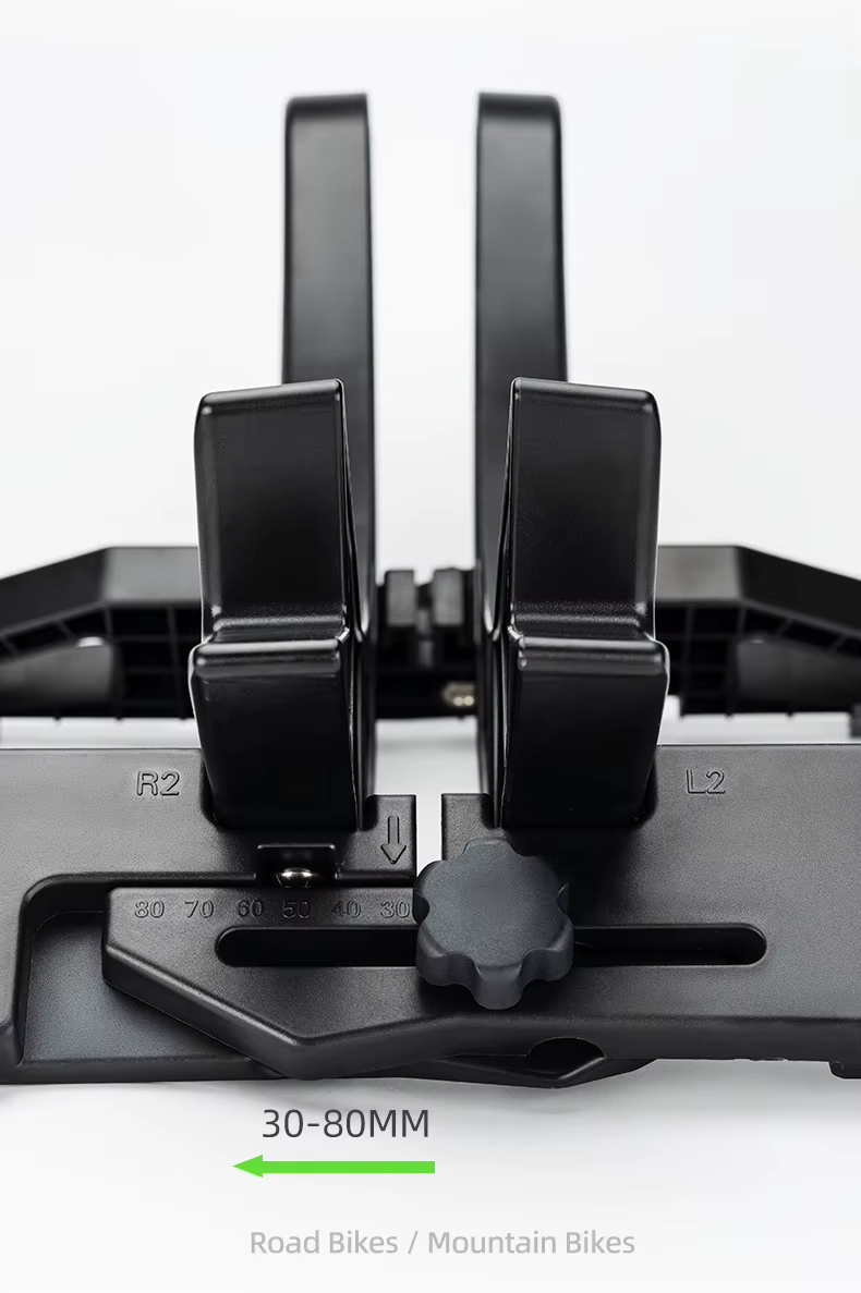 Ajuste Preciso para Diferentes Pneus: Suporte ajustável de 30 a 80 mm, compatível com bicicletas de estrada e mountain bikes. O sistema de regulagem garante encaixe firme e seguro, adaptando-se facilmente à largura da roda para maior estabilidade durante o uso: