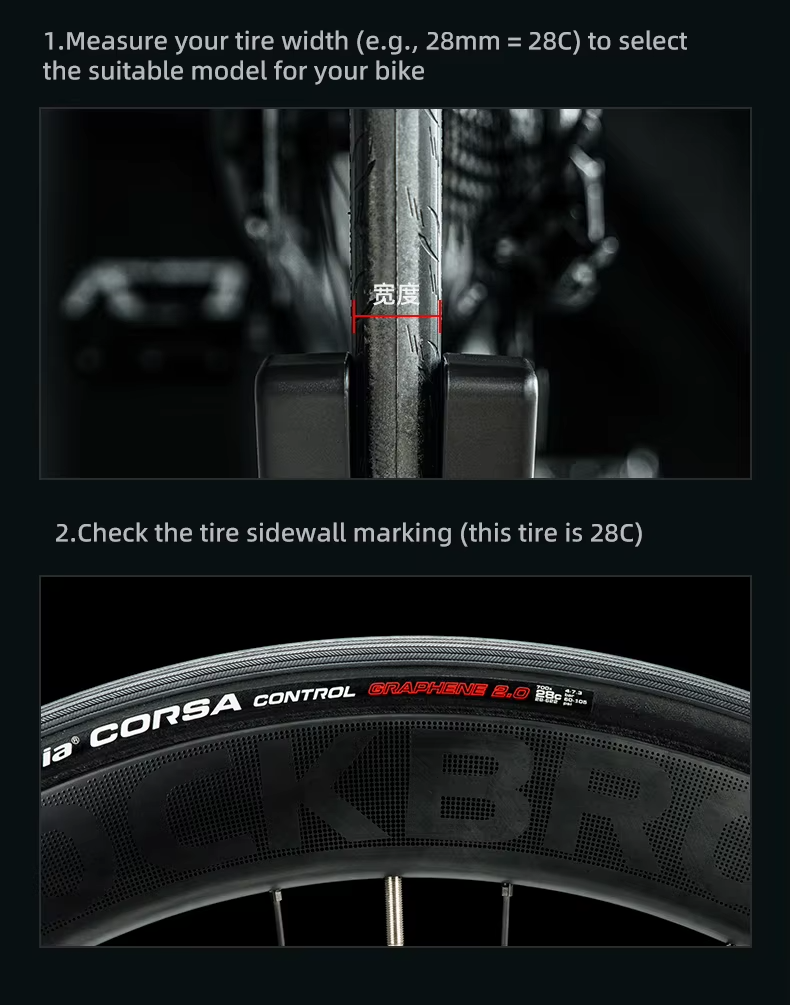 Meça a largura do pneu (ex.: 28 mm = 28C) para selecionar o modelo compatível.